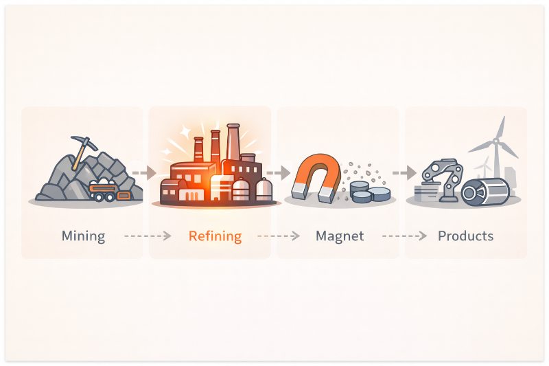 많은 사람이 희토류를 석유처럼 생각해서 “땅만 파면 된다”고 본다. 하지만 희토류는 채굴 → 분리·정제 → 금속/합금 → 자석 제조 → 부품 적용으로 이어지는 밸류체인이 길다. 여기서 병목이 생기는 구간이 분리·정제와 자석 제조인 경우가 많다. 즉, 광산이 있어도 정제/소재화가 막히면 “있는데 없는 자원”이 된다.