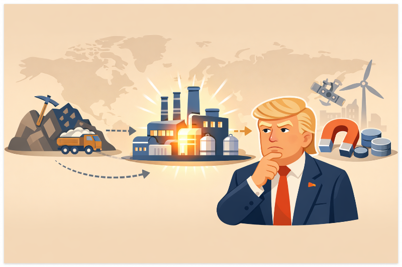 간단히 말해 “미국 제조와 국방의 핵심 부품(특히 영구자석)을 중국의 손에서 빼오려는 전략”이다. 희토류 자체가 중요한 게 아니라, 희토류가 들어간 자석·모터·유도무기·레이더·위성·전기차 같은 ‘결정적 제품’이 중요하다. 트럼프의 시선에서 희토류는 공급망을 장악한 쪽이 최종 산업을 지배하는 게임이다.