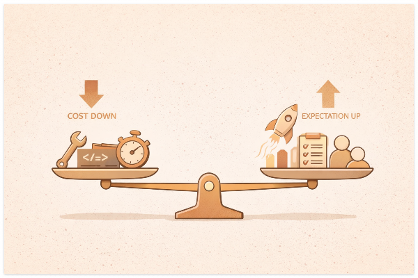 AI 코딩 도구는 분명 개발 비용을 낮춘다. 그런데 비용만 낮아지는 게 아니다. 기능 출시 속도가 빨라지면 고객의 기대 수준도 같이 올라간다. 더 빠른 업데이트, 더 많은 실험을 당연하게 여기기 시작하는 것이다.